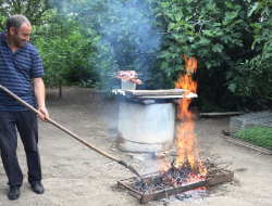 サツナヘリと呼ばれる木製の酒槽でブドウを踏み潰し、出た果汁とサツナヘリに残った果皮や果肉などを全てクヴェヴリに投入します。